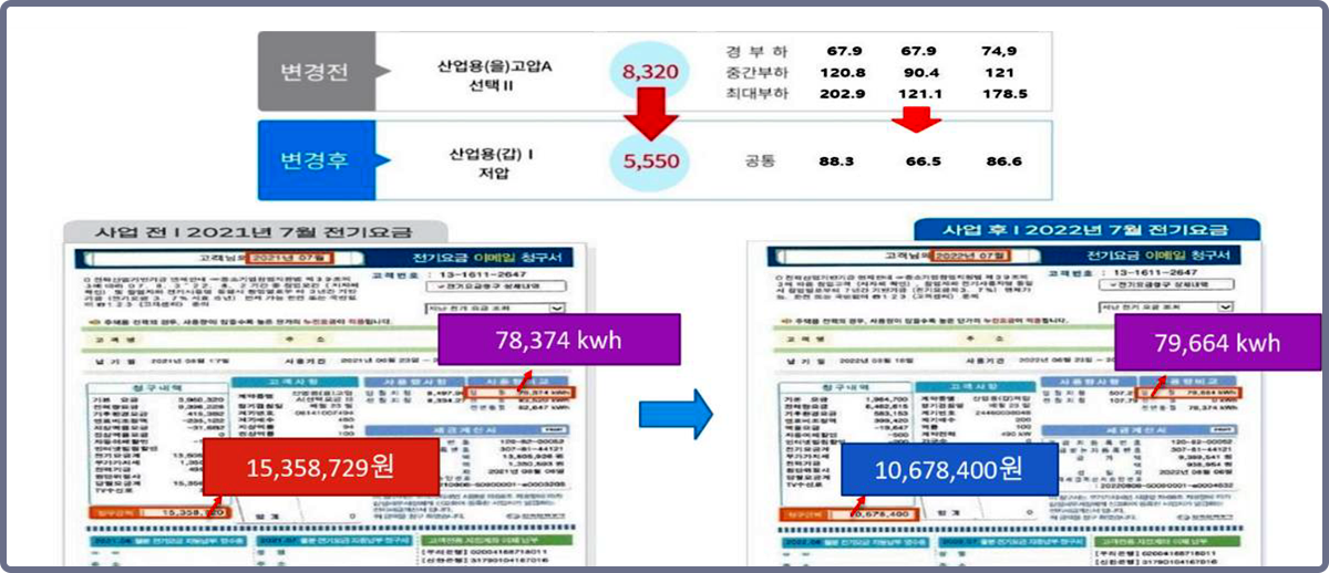 산업용 고압(을) 8,320원에서 산업용 저압(을) 5,550원으로 전환해 전력 사용량은 그대로 유지하면서, 사용할수록 단가 절감 효과가 커집니다.