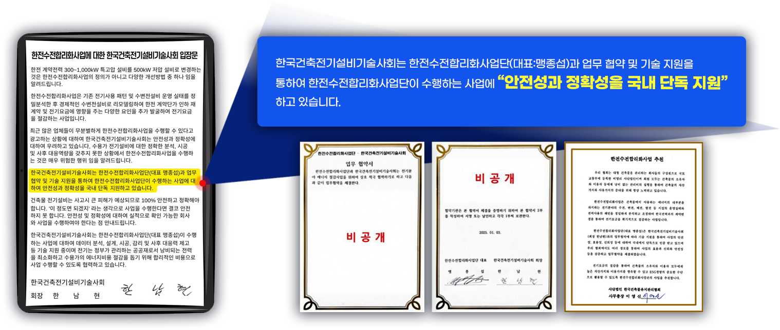 현대 건축물의 심장과 신경망인 전기설비의 총합설계를 전담하고, 그 안전과 효율적 운용을 책임지는 한국건축전기설비기술사회가 기술지원합니다. 한전수전합리화사업단(대표:맹종섭)만이 한국건축전기설비기술사회의 유일한 전략적 파트너사입니다.